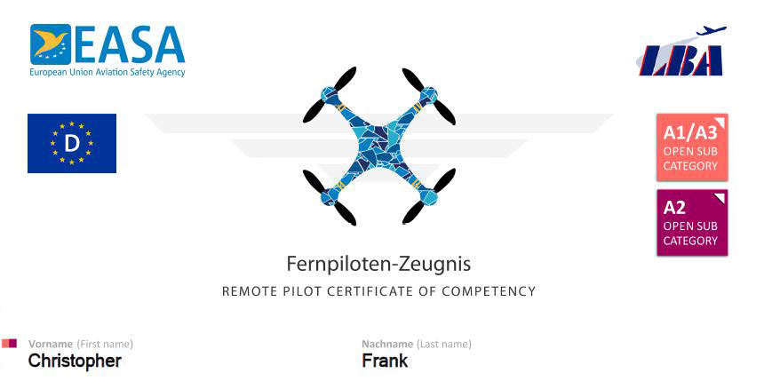 Seit 2021 bin ich zudem vom Luftfahrtbundesamt lizensierter Fernpilot in allen Subklassen der offenen Kategorie (Fernpiloten Zeugnis, auch umgangssprachlich als "großer Drohnenführerschein" bekannt). Dadurch bin ich in der Lage Flüge mit der Drohne innerhalb der EU zu planen und durchzuführen, die ohne diese Lizenzen nicht möglich wären, wie etwa der Einsatz einer DJI Mavic Air 2s mit 5,4k Videoauflösung zum Filmen in Wohngebieten. Der Einsatz einer Drohne bietet Möglichkeiten zu Perspektiven für Foto und Film, die jede Produktion bereichern, sei es bei einer Hochzeit oder einem kommerziellen Shooting/Dreh.